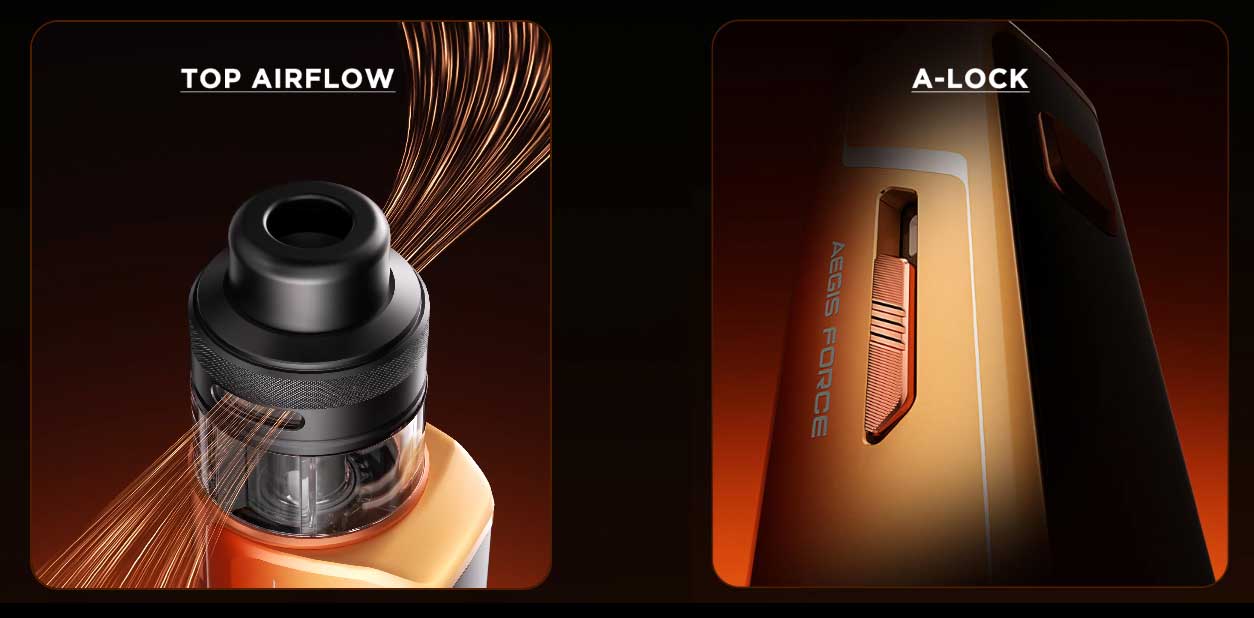 Zusätzlich zu den unterschiedlichen Mundstücken verfügt das Aegis Force Kit über eine regulierbare Airflow-Kontrolle. Über einen Schiebemechanismus lässt sich der Luftstrom präzise einstellen – von streng und restriktiv bis offen und luftig. In Kombination mit den passenden Coils ergibt sich dadurch ein sehr variables Dampferlebnis.